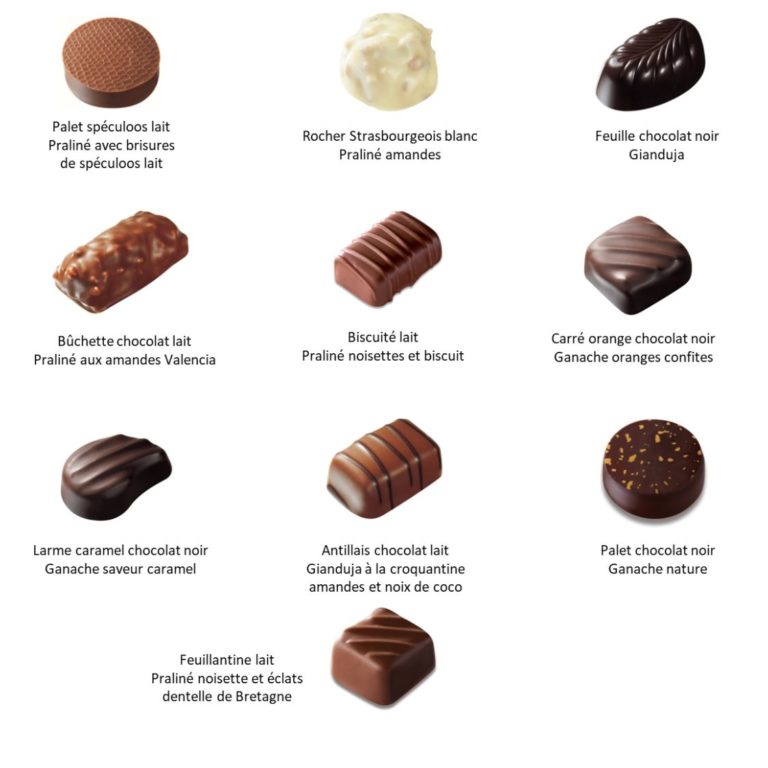 Sucre 37,0%, masse de cacao 19,4%, beurre de cacao 10,7%, NOISETTES 7,7%, poudre de LAIT entier 7,4%, AMANDES 5,8%, beurre pâtissier (LAIT) 2,7%, sirop de sucre inverti 1,6%, stabilisant: sorbitol 1,3%, LACTOSE 1,2%, biscuit 0,8% (farine de BLE, sucre, beurre concentré (LAIT), LAIT en poudre, poudre à lever : E500 et E503, sel, arôme naturel de vanille), crème (LAIT) 0,7%, stabilisant: glycérol 0,7%, écorces d’oranges confites 0,6% (écorces d’oranges, sucre, sirop de glucose), éclats de crêpe dentelle 0,55% (farine de BLE, sucre, LAIT demi-écrémé, beurre concentré (LAIT), sel), noix de coco 0,5%, émulsifiant: lécithines (SOJA) 0,5%, poudre de cacao 0,4%, speculoos 0,3% (farine de BLE, huile végétale: colza, sirop de sucre candi, sucre semoule, cassonade, sucre de canne, beurre concentré (LAIT), sucre caramélisé, cannelle en poudre, agent levant : carbonate d’ammonium, arôme naturel de vanille), éclats de NOISETTES caramélisées 0,1% (NOISETTES, sucre, caramel (sucre, eau)), arômes 0,02%, sel 0,02%, colorant: E100 (curcumine) <0,01%.