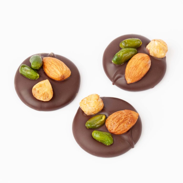 Chocolat noir (masse de cacao, sucre, beurre de cacao, émulsifiant : lécithines (SOJA), arôme naturel de vanille), AMANDES caramélisées 10% (AMANDES, sucre, sirop de glucose, miel), NOISETTES caramélisées 7% (NOISETTES, sucre, sirop de glucose, miel), pistaches 6%, agent d’enrobage : gomme arabique.