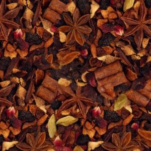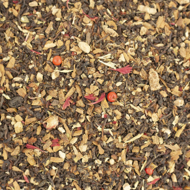 Thé noir d’Inde* (49%), épices (cannelle*, gingembre*, cardamome*, baies roses*) (41%), écorces d’orange* (4%), hibiscus*, huiles essentielles de (mandarine*, orange*, bergamote*) (2%), extrait de vanille*, pétales de bleuet*.*Ingrédients issus de l’agriculture biologique. Agriculture Non UE